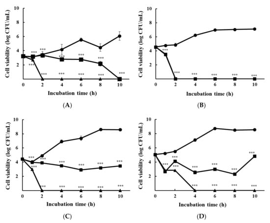 Time-kill analysis of ε-PL at 1/2 × MIC, 1 × MIC, and 2 × MIC against three multi-species cultured bacteria plated on a selective agar medium. Cell viability using (A) XLD agar for S. Enteritidis KCCM 12021; (B) Oxford agar for L. monocytogenes H7962 serotype 4; (C) EMB agar for E. coli O157:H4 FRIK 125 + E. coli ATCC 25922; and (D) TSA agar for S. Enteritidis KCCM 12021 + L. monocytogenes H7962 serotype 4 + E. coli O157:H4 FRIK 125 + E. coli ATCC 25922. All data are expressed as the mean ± standard error. Circle, Control; square, 1/2 × MIC; triangle, 1 × MIC. *** p < 0.001, compared to the control group.
