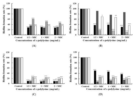 Antibiofilm assay of ε-PL at 1/2 × MIC, 1 × MIC, and 2 × MIC against the bacterial species (S. Enteritidis KCCM 12021, L. monocytogenes H7962 serotype 4, E. coli O157:H4 FRIK 125, and E. coli ATCC 25922). (A) inhibition of biofilm formation in TSB medium for 24 h; (B) degradation of mature biofilm in TSB medium for 24 h; (C) inhibition of biofilm formation in the CJ medium for 24 h; and (D) degradation of mature biofilm in the CJ medium for 24 h. ε-PL concentrations were relative to the MIC for each organism. All data are expressed as the mean ± standard error and the experiments were conducted in triplicate. Black square, S. Enteritidis KCCM 12021; dark gray square, L. monocytogenes H7962 serotype 4; light gray square, E. coli ATCC 25922 + E. coli O157:H4 FRIK 125; white square, S. Enteritidis KCCM 12021 + L. monocytogenes H7962 serotype 4 + E. coli ATCC 25922 + E. coli O157:H4 FRIK 125. All data are expressed as the mean ± standard error and the experiments were conducted in triplicate. * p < 0.05, ** p < 0.01, *** p < 0.001, compared to the control group.