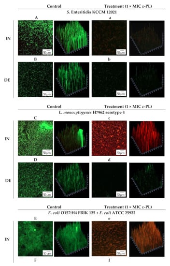 The inhibitory and degradation effects of ε-PL on the selective pathogen biofilms were optically analyzed using CLSM (Figure 4). Syto9 and PI differ in terms of the penetration capability of cell membranes [44]. Syto9 could penetrate both dead and live cells because of its high permeability, whereas PI has high molecular mass that it can only penetrate cells with damaged membranes. As shown in the CLSM images, ε-PL caused damage to live biofilm cells of S. Enteritidis KCCM 12021, L. monocytogenes H7962 serotype 4, and the E. coli group. The biofilm of the control showed abundant live colonies (green fluorescence), whereas biofilms treated with ε-PL showed few cells or increasing dead cells (red fluorescence). Some photographs of samples treated with 1 × MIC of ε-PL showed a rare-shaped structure due to the adsorption of ε-PL (Figure 4e,g), whereas few other samples showed death of most cells with no reduction in the total cell count (Figure 4c), which demonstrated the powerful penetrability of ε-PL to deeper biofilms, although the rate of eradication of the biofilm slightly decreased. Nevertheless, these results are worthwhile as green fluorescence (live cells) is rarely observed in both types. Visual observation by CLSM proved that ε-PL could exhibit anti-biofilm activity against Salmonella, Listeria, and E. coli, as also evidenced by the crystal violet assay results of the ε-PL antibiofilm activity (Section 3.2.1).