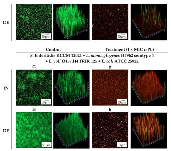 Confocal laser scanning microscopy (CLSM) images of bacterial biofilms cells stained with SYTO 9 (live/green) and PI (dead/red) on glass coupons (100 x magnification). Control and treatment (1 × MIC of ε-PL) are marked in capital letters and small letters, respectively. IN, inhibition of biofilms; DE, degradation of mature biofilms. (A,a,B,b) S. Enteritidis KCCM 12021; (C,c,D,d) L. monocytogenes H7962 serotype 4; (E,e,F,f) E. coli O157:H4 FRIK 125 + E. coli ATCC 25922; (G,g,H,h); S. Enteritidis KCCM 12021 + L. monocytogenes H7962 serotype 4 + E. coli O157:H4 FRIK 125 + E. coli ATCC 25922.