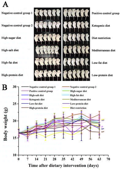 Effects of different dietary patterns on body weight. (A) Images of tumors in mice, n = 6. (B) Mice weights were recorded every 7 days. #b p < 0.05 and ##b p < 0.01 compared with negative control group 2.