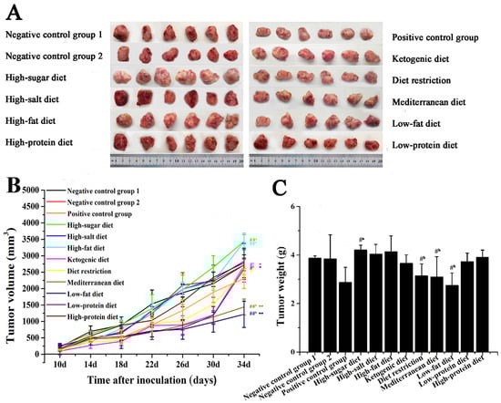 Effects of different dietary patterns on tumor in situ. (A) Image of a mouse tumor removed after dissection. (B) Tumor volume of mice was recorded every 4 days. (C) Tumor weight of mice removed after dissection. #a p < 0.05 and ##a p < 0.01 compared with negative control group 1. #b p < 0.05 and ##b p < 0.01 compared with that of negative control group 2. * p < 0.05 and ** p < 0.01 compared with that of positive control group.