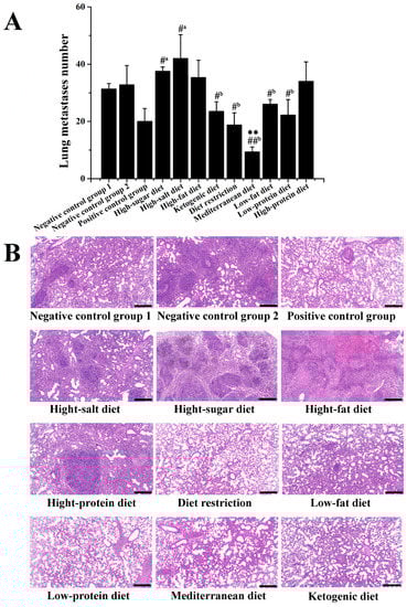 Effects of different dietary patterns on lung metastasis of 4T1-xenograft mice. (A) Number of lung metastasis. #a p < 0.05 compared with that of negative control group 1. #b p < 0.05 and ##b p < 0.01 compared with that of negative control group 2. ** p < 0.01 compared with that of positive control group. (B) HE-staining of lung tissues (scale was 400 μm).