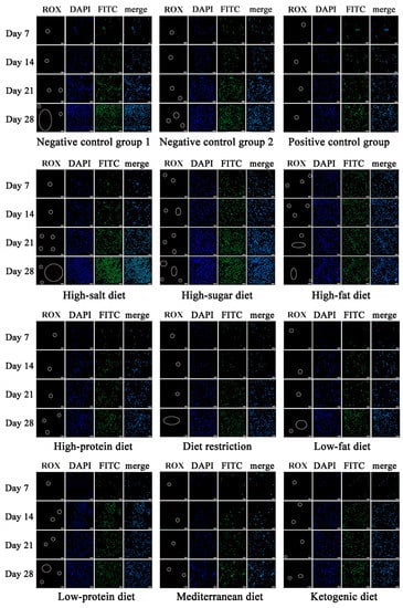 Fluorescent images of CTCs captured in vivo for different dietary patterns. CTCs were marked by circle (scale was 25 μm). ROX, acceptor fluorophore (red).