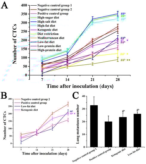 Previous research by our group explored the effective capture of CTCs on mouse tumor models with functional indwelling needles [9]. This method can capture CTC in the blood on the seventh day after tumor inoculation, which can detect the occurrence of tumor metastasis in early cancer. In this study, the effects of different dietary patterns on breast cancer metastasis were evaluated by detecting CTC numbers at different time points during breast cancer metastasis and according to the trend of the number of CTCs (Figure 4). According to the results of in vivo capture of CTC in a mouse 4T1-xenograft model, CTCs can be captured on the seventh day after vaccination. As shown in Figure 5A, the change in the number of CTCs was closely related to cancer metastasis, and CTC numbers showed an upward trend with the extension of the duration of cancer. The number of CTCs in the five dietary patterns including low-fat diet, ketogenic diet, low-protein diet, diet restriction, and Mediterranean diet was lower than that of negative control group 2 (p < 0.05), among which the Mediterranean diet and diet restriction groups exhibited stronger anti-metastasis effect (p < 0.01), and showed more effective anti-metastasis effect than that of the positive control group (p < 0.05). Low-protein diet group had comparable antimetastatic effects to that of the positive control group (p > 0.05). In Figure 5B,C, compared with that of negative control group 2, the increase in a number of CTCs in the low-fat diet and ketogenic diet groups was also delayed (p < 0.05), however, the antimetastatic effect was worse than that of the positive control group. In the process of tumor metastasis, different dietary patterns have different effects on the number of CTCs. For example, the Mediterranean diet group showed a more effective anti-metastasis effect over the course of cancer metastasis than that of the positive control group, but the low-fat diet group showed a more rapid increase in the number of CTCs in the later stages of cancer, and the antimetastatic effect was worse compared with that of early and middle stages. Based on the detection of the number of CTCs, the effects of these different dietary patterns on cancer metastasis can be monitored in real-time during the metastasis process.