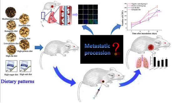 In this study, 10 different dietary patterns including standard diet, high-salt diet, high-sugar diet, high-fat diet, low-fat diet, high-protein diet, low-protein diet, ketogenic diet, diet restriction, and Mediterranean diet were selected as the research subjects. While studying the effects of different dietary patterns on the growth of carcinoma in situ and lung metastases, we focused on the in vivo CTCs capture to assess the cancer metastasis in real-time to evaluate the effects of different dietary patterns on tumor metastasis. This study provided valuable suggestions for people to eat properly to achieve the purpose of cancer prevention or treatment, and this is an important report evaluating the effects of multiple dietary patterns on breast cancer metastasis simultaneously.