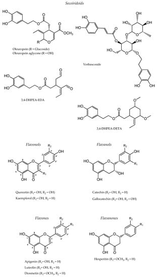 However, despite the significant amount of the aforementioned nutrients present in olive leaves, major attention is devoted to their phenolic fraction (e.g., secoiridoids, flavonoids, and simple phenols), which ranges from 15 to 70 mg/g fresh weight, because of its health benefits and bioactivity []. In addition to their diversity (Figure 1), phenolic compounds are found in olive leaves at different concentration levels. The ranges of individual phenolic compounds contents in the literature are reviewed in Table 1.