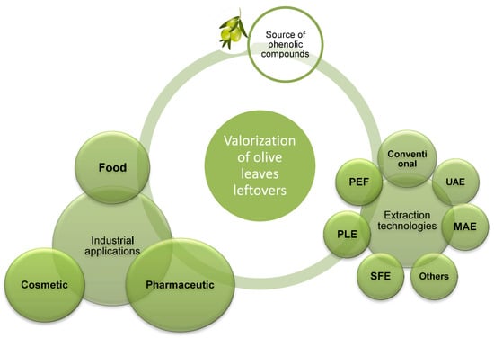 This review focuses on olive leaves’ functional compounds (especially polyphenols) and the extraction methods for their recovery, as well as the potential industrial uses in the pharmaceutical and food sectors of olive leaves and extracts.