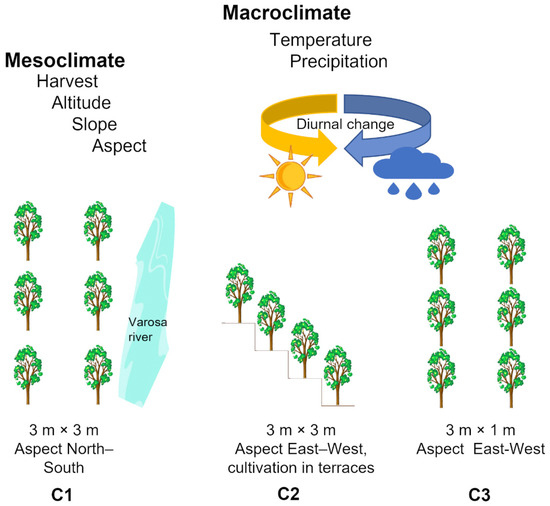 Schematic representation of the three plantation fields (Varosa (C1), Valverde (C2), and São João de Tarouca (C3)) where the three cultivars of Sambucus nigra L. ‘Sabugueira’, ‘Sabugueiro’, and ‘Bastardeira’ were grown. Both the macroclimate in the Varosa Valley region and the mesoclimate conditions in each field may impact the ripening process.