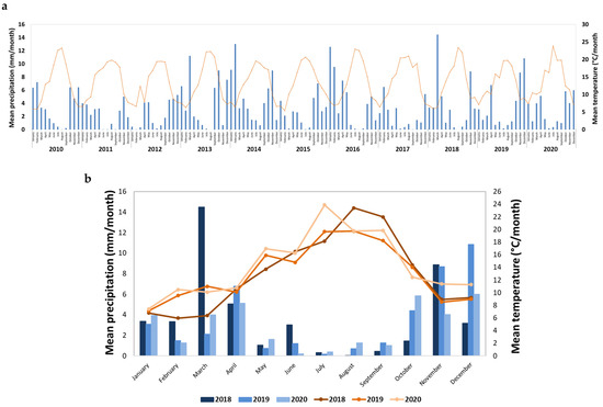 Meteorological data available for Varosa Valley, expressed as mean precipitation (blue colors) and temperature (orange colors); (a) data from the last decade (2010–2020) and (b) zoom of the three harvests under study (2018–2020).