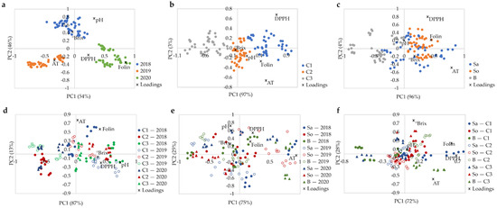 ASCA biplot for (a) harvest, (b) field, (c) cultivar, (d) harvest × field, (e) harvest × cultivar, (f) field × cultivar factors obtained for ripe elderberries (three cultivars collected on three fields for three consecutive harvests were considered); significance test reported in Table 4.