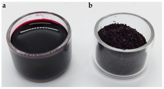 Products obtained from ripe elderberries. (a) Juice and respective (b) pomace powder.