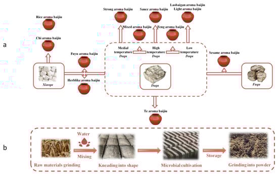 Baijiu, known as Chinese national liquor, is a part of Chinese traditional culture. As one of the daily alcoholic beverages, it is prevalent among Chinese people []. Qu, as the source of flavor and microorganism for baijiu, has received wide attention in baijiu production [,]. Qu is a starter, saccharifying agent and aroma generator in baijiu production, and plays a vital role in baijiu making []. The main types of Qu are Daqu, Xiaoqu, and Fuqu, and the primary raw materials of Qu are wheat, sorghum, and bran, respectively. The relevant microbes that play a major role in the Qu fermentation including moulds, yeasts, and bacteria []. There are 12 flavor types of baijiu, among which Strong, Light, Sauce, and Rice aroma baijiu are four basic flavor types, and other flavor types are derived from the basic flavors []. The 12 flavor types of baijiu are closely related to the kinds of Qu. According to the main technical characteristics of the 12 flavor types of baijiu and the primary production technology of Qu, the relationship between flavor types and Qu is summarized as shown in Figure 1a.