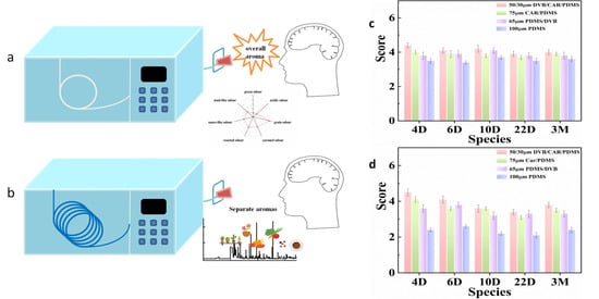 DI-GC-O sniffing diagram (a), with the short unfilled capillary column. GC-O sniffing diagram (b), with the packed column. Screening and optimization of extraction head by DI-GC-O Aroma similarity (c) and aroma intensity (d).