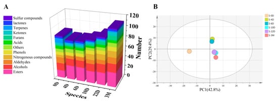 According to the HS-SPME extraction method in Section 2.4.2, 139 compounds were identified in six different maturity stages Daqu samples (shown in Table 1), including 36 esters, 7 acids and ketones, 22 alcohols, 4 lactones, 8 phenols and furans, 14 aldehydes, 12 nitrogenous compounds, 9 terpenes, 3 sulfur compounds and 9 others. The number of volatile compounds in six different mature stages Daqu was in the order of “S-3M > S-22D > S-10D = S-0D > S-6D > S-4D”. The variation of compounds types in Daqu is shown in Figure 3A, and it can be found that the aroma of Daqu S-3M was more abundant.