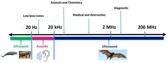 Ultrasound is known as a green novel technology due to its role in environmental sustainability. Ultrasound waves are classified into four different categories based on the mode of vibration of the particles in the medium, with respect to the direction of propagation of the wave, viz., longitudinal waves, transverse waves, surface waves, and plate waves [11]. Depending upon the frequency of the sound, ultrasound waves are divided into three categories, as shown in Figure 1: viz., Power Ultrasound (20–100 kHz), High-Frequency Ultrasound (100 kHz–1 MHz), and Diagnostic Ultrasound (1–500 MHz). Ultrasonic waves of frequency 20–100 kHz are used in chemical systems. Waves of frequency 1–10 MHz are used in animal navigation and communication, for the detection of cracks in solids, as well as for diagnostic purposes [7,10,12].