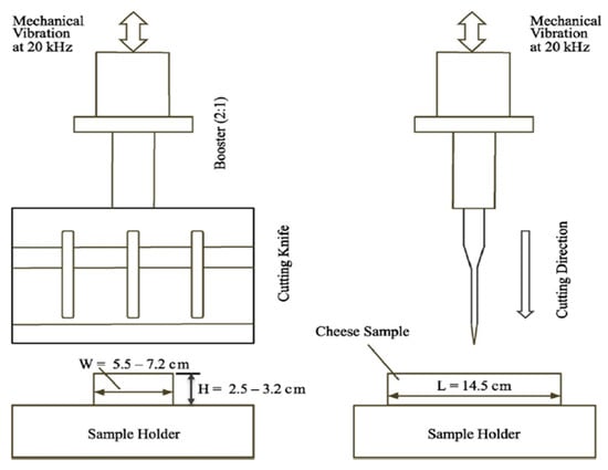 The piezo-electric transducer converts the voltage that is supplied by a generator into a corresponding mechanical displacement at the outlet of the piezo element. The amplifier then transmits this displacement to the sonotrode, which induces an oscillation of a defined frequency at the cutting edge of the sonotrode [36]. The cutting mechanism is more effectively used for cutting viscoelastic and viscoplastic foods, fragile and frozen foods, as well as heterogeneous products. The quality of food cut by ultrasonics, and the cutting efficiency, depends on the geometry of the cutter, the direction of the vibration of the cutter relative to the cutting direction, the frequency and amplitude of the cutter, and the product’s properties, such as its microstructure, moisture or fat content, or temperature sensitivity [6,42,44].