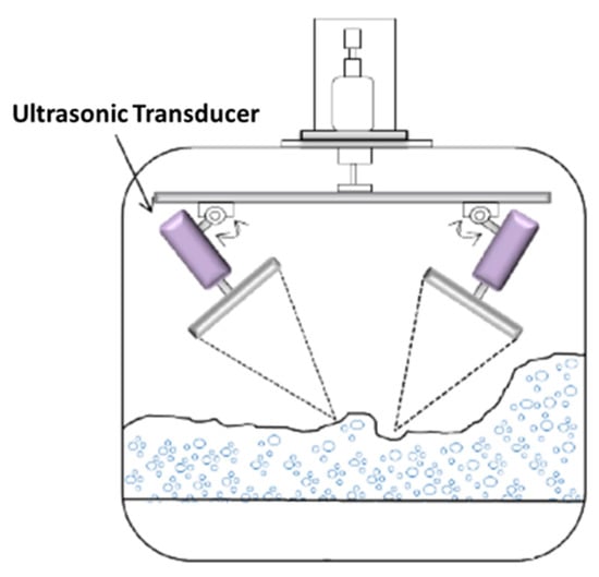 Somewhat conversely, ultrasonic treatment has also been highly effective in reducing the extent of foaming [91,92]. The use of a powerful ultrasonic transducer in the air space directly above a foaming solution may produce a partial vacuum on the foam bubble surface being generated by the high acoustic pressure [92]. The schematic view of the ultrasonic defoaming equipment is described in Figure 4. The impingement of radiation pressure on the bubble surface, the resonance of the foam bubbles that create interstitial friction causing bubble coalescence, cavitation, atomizing from the liquid film surface, and/or acoustic streaming is effective in destroying the foam [92]. As a defoaming tool, Rodriguez et al. [93] have used airborne ultrasonic plate transducers. At equivalent foam concentrations, defoaming efficiency increased with increasing ultrasonic intensity (to 5 cm3 at 10 W/cm2) and treatment time. The researchers also tested how effectively ultrasonic therapy worked on two types of foam: a stable foam with a 2.85-g/L surfactant concentration and bubble sizes ranging from 0.2 to 2.0 mm, and a dry and light foam with a 0.71-g/L concentration and bubble sizes ranging from 0.2 to 10.0 mm. The liquid-to-foam volume ratios were 0.02 and 0.005, respectively. After a 98-millisecond ultrasonic treatment, the 2.85-g/L foam had a defoaming volume of 5 cm3, compared to 13 cm3 for the 0.71-g/L foam. The key benefits of airborne ultrasonic defoaming are the lack of contact with the foam, which keeps the end product sterile, ensures the ability to clear foam from flammable liquids, and ensures the lack of adjunct materials [49].