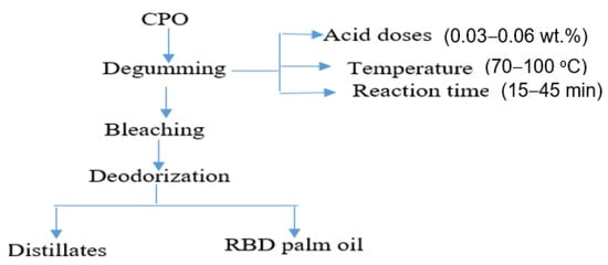 The refining process of CPO could be conducted physically or chemically [,]. However, the physical refining process is preferable because of its substantial advantages over the chemical refining process, including higher oil yield, preventing excessive oil loss, minimizing the use of chemicals, and lowering the environmental impact of palm oil processing [,,]. The physical refining process consists of three major processes: degumming, bleaching, and deodorization [,]. Degumming is the first step of the refining process of palm oil. The bleaching process is needed to extract the color pigments, protein degradation, traces of metal, and catalysts after the hydrogenation process []. The last unit process is the deodorization process. It is needed to eliminate the volatile components or the impurities that cause odor and off-flavor using steam distillation [].