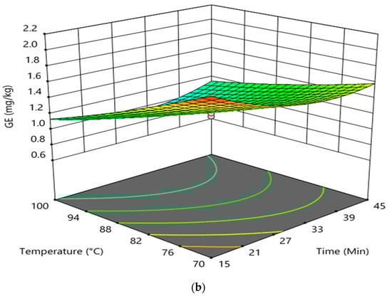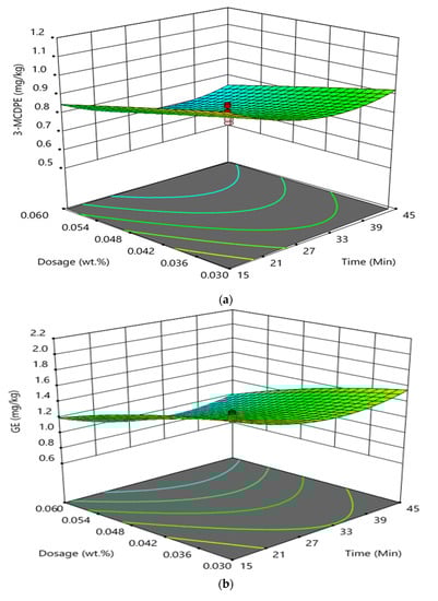 The interaction effect between reaction time and temperature in the degumming process on the formation of GE and 3-MCPDE in RBD palm oil is shown in Figure 3. The interaction between reaction time and the temperature had an insignificant effect on the formation of 3-MCPDE in RBD palm oil. However, it had an insignificant impact on the GE formation in RBD palm oil. It was found that at higher reaction time and constant doses of phosphoric acid (0.045 wt%), the increase in temperature had a negligible effect on the 3-MCPDE formation in RBD palm oil. Conversely, the 3-MCPDE formation in RBD palm oil decreased with enhancing the reaction time up to 35 min and increased with an increase in reaction time at a higher temperature and a constant phosphoric acid dose of 0.045 wt%. In the case of GE formation at a higher temperature and at a constant dose of phosphoric acid (0.045 wt%), the increase in the reaction time slightly decreased the GE formation from 15 to 30 min and increased after that. However, the GE formation was sharply decreased with increasing temperature at higher reaction time and constant phosphoric acid doses. The elevated temperature of the degumming process increased the removal of gum present in CPO, which substantially prevents the GE formation in RBD palm oil and therefore decreased the GE formation with the increasing degumming temperature [].