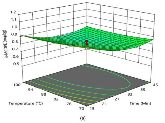 Figure 4 shows the interaction effect between temperature and phosphoric acid doses in the degumming process on GE and 3-MCPDE formation in RBD palm oil. It was observed that the interaction between temperature and phosphoric acid doses in the degumming process had a significant effect on the 3-MCPDE formation (Figure 4a) and GE formation (Figure 4b) in RBD palm oil. At higher phosphoric acid doses and constant reaction time (30 min) of the degumming process, the increase in the temperature from 70 to 100 °C decreased the 3-MCPDE formation in RBD palm oil. On the other hand, the increase in the phosphoric acid dosed from 0.03 wt% to 0.06 wt% decreased the formation of 3-MCPDE in RBD palm oil at higher temperatures and at constant reaction time (30 min). In the case of GE formation, the increase in the temperature from 70 to 100 °C sharply decreased the GE formation in RBD palm oil at a higher temperature and at constant reaction time. At higher phosphoric acid doses and a constant reaction time, the increase in temperature decreased the formation of GE in RBD palm oil [,].