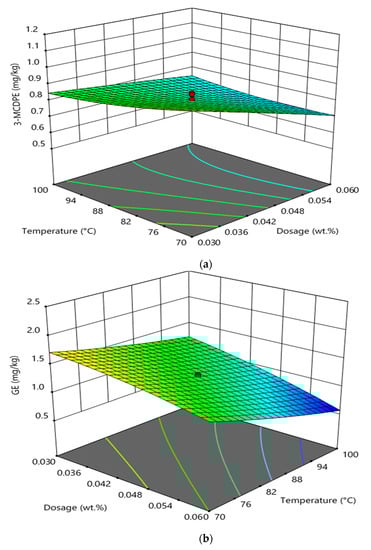 Interaction effect between temperature and phosphoric acid doses in the degumming process on the formation of 3-MCPDE (a) and GE (b) in RBD palm oil.