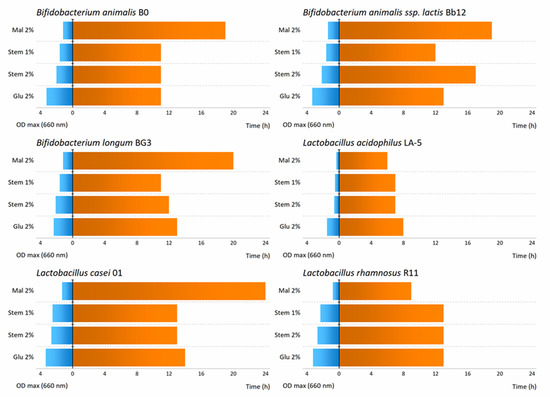 | Probiotic Strains | Maximum Growth Rate (µmax/h) | |||