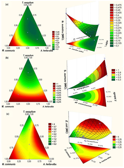 The 2D contour plots and 3D surface plots of the responses (MICs) for B. subtilis, S. aureus, and E. coli are shown in Figure 2.