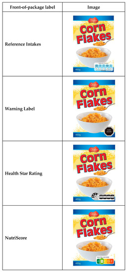 The five different FoPL, as featured on one of the mock products (breakfast cereal), is shown in Figure 1. Supplemental Table S1 details the information available on each FoPL. Each label appeared in the same position and covered about the same surface area on the package.