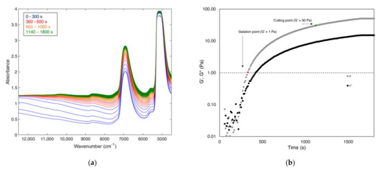 The rheological and FT-NIR spectral behaviours were compared. Considering the trial EPI60-R1, it was possible to notice that the rheological gelation point occurring after 330 s (red dot in Figure 1b) corresponded with the first red spectrum in Figure 1a, when the slowdown of the baseline drift was observed. After the rheological cutting point (green dot in Figure 1b), the spectra resulted constant in shape and slope (green spectra in Figure 1a).