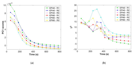 Similarly, T2 values were extracted from the PCA calibration model (Figure 4b). Here, a first minimum was detected after 120–180 s (EPI60) and 240 s (EPI40), followed by a fast increase until a maximum at 300–360 s, according to the considered trial, and a decrease up to a plateau for all the trials after 600 s. It seems that the PC1 scores and T2 trends could be useful to describe both coagulation start and end in accordance with the rheological results (Table 1). However, to confirm the reliability of the results, data acquired at higher measurement frequency are discussed hereafter.
