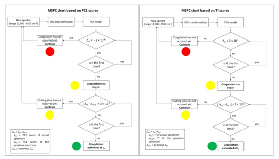 The decision trees summarize how real-time coagulation control could be performed using FT-NIR spectra collected online, to help the personnel by an automated decision-making procedure. Both decision trees estimated the beginning of the coagulation by the actual difference in PC1 scores and T2, whereas the end of the coagulation was defined by the absolute difference between two consecutive spectra (Δtn − Δtn−1). The assessment of the two key moments was based on specific thresholds in Δtn or |Δtn − Δtn−1|, defined according to the deviation of PC1 and T2 after the coagulation occurrence according to rheological measurements. A further control was added to manage possible noise in the recorded measures; in detail, the specific condition in the decision points should be repeated twice in a raw to confirm the coagulation start or end. The decision tree could be easily converted into a simple light signal to be interpreted by the personnel managing the coagulation process. Indeed, a red signal would appear in the control system up to the beginning of the coagulation, i.e., when Δtn overcomes two times the defined limits. At this moment, the light signal would convert into yellow up to the fulfilment of the second condition of the decision tree, i.e., when the value of |Δtn − Δtn−1| is below the defined threshold for two consecutive times. At the estimated coagulation time, the light would convert into green, communicating to the personnel that the coagulation phase is over.