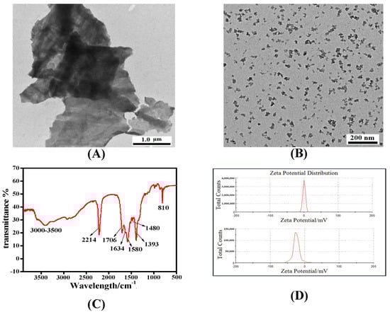 (A) TEM image of bulk-g-C3N4, (B) TEM image of carboxylated-g-C3N4 NPs, (C) FTIR spectrum of carboxylated-g-C3N4 NPs, and (D) ZP of bulk-g-C3N4 (top) and carboxylated-g-C3N4 NPs (bottom).