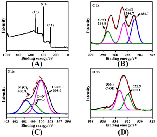 (A) XPS spectrum, high-resolution spectra, (B) C 1s, (C) N 1s, and (D) O 1s of the carboxylated-g-C3N4 NPs.