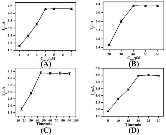 The plots for the relationship of (A) the concentration of ssDNA (1, 2, 3, 4, 5, 7 µM), (B) the concentration of MB (20, 30, 40, 50, 60 µM), (C) the incubation time of carboxylated-g-C3N4 NPs and amino-terminated ssDNA (15, 30, 45, 60, 75, 90 min) and (D) the binding time of ssDNA and MB (5, 10, 15, 20, 25, 30 min) on the peak currents with electrochemical signal obtained at MB/ssDNA/carboxylated-g-C3N4/chitosan/GCE in 0.1 M PBS (pH = 7.4) without getting attacked by •OH.
