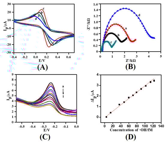 (A) CVs of (a) chitosan/GCE, (b) bulk-g-C3N4/chitosan/GCE, (c) carboxylated-g-C3N4/chitosan/GCE and (d) ssDNA/carboxylated-g-C3N4/chitosan/GCE in the 1 mM [Fe(CN)6]3−/4− (1:1) solution containing 0.1 M KCl at a scan rate of 100 mV·s−1, (B) EIS of (a) chitosan/GCE, (b) bulk-g-C3N4/chitosan/GCE, (c) carboxylated-g-C3N4/chitosan/GCE and (d) ssDNA/carboxylated-g-C3N4/chitosan/GCE in the 5 mM [Fe(CN)6]3−/4− (1:1) solution containing 0.1 M KCl (pH = 7.4), (C) SWV plots of MB in 0.1 M PBS (pH = 7.4) obtained from ssDNA/carboxylated-g-C3N4/chitosan/GCE after incubation with various concentrations of Fenton solution. The concentrations of •OH were (a) 4.06 fM, (b) 14.74 fM, (c) 36.14 fM, (d) 48.46 fM, (e,f) 59.91 fM, (g) 70.34 fM, (h) 78.79 fM, (i) 90.62, (j) 101.89 fM, (k) 113.90 fM and (l) 122.79 fM and (D) The relationship between current difference (ΔIp) and the concentration of •OH. ΔIp = I0 − Ip, I0 and I were the peak currents of MB obtained from electrodes before and after incubated with various concentration of Fenton solution.