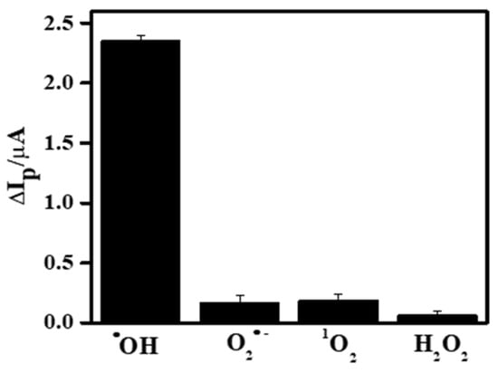 The specificity detection of ssDNA/carboxylated-g-C3N4/chitosan/GCE in PBS with •OH (1 mM Fe2+ and 6 mM H2O2), O2•− (100 µM xanthine + 22 mU xanthine oxidase), 1O2 (1 mM NaClO and 1 mM H2O2), and H2O2 (1 mM), respectively.