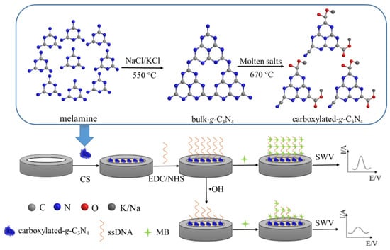 In this paper, carboxylated-g-C3N4 NPs were successfully prepared by a molten salt method, using melamine as the precursor and NaCl/KCl as eutectic salts. Then, a single-stranded oligonucleotide/carboxylated-g-C3N4/chitosan/glassy carbon electrode (ssDNA/carboxylated-g-C3N4/chitosan/GCE) based on Fenton-mediated ssDNA damage mechanisms for sensitive determination of •OH was constructed, and methylene blue (MB) was used as a signal probe. It was confirmed that •OH could attack ssDNA to cause several ways of damage, including strand breakage and base release []. The prepared sensor presented a wide linear range and suitable selectivity toward the detection of •OH. The application of the sensor to the determination of •OH in real meat samples was tested and compared with that of ESR. More details were discussed in the following sections.