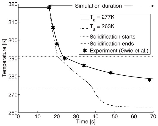 Temperature profile of a 2 mm droplet, initially at 318 K, suspended in a chamber that is at 277 K and 1 bar, along with the experimental data of Gwie et al. [26] (asterisk symbol, copyright permission has been obtained). An additional simulation is performed at K. The start of solidification is at 291 K and the solidification ends at 273 K. (Figure reproduced from [42,43] by resimulating the model).