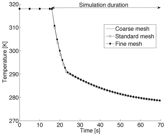 Temperature profile of a 2 mm droplet, initially at 318 K, suspended in a chamber that is at 277 K and 1 bar, using three different mesh resolutions.