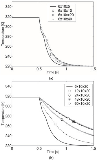 It must be noted that unlike the model validation case, the droplet size in this parametric study is an order of magnitude smaller. Hence, before conducting the above simulations, to ensure mesh independence, a mesh refinement was done for a 100 micron CB droplet experiencing an ambient temperature of 220 K and a relative drop-gas velocity of 20 cm/s. Specifically, starting from a grid with cells uniformly distributed in the radial, azimuthal and axial directions, respectively, refinement was done in each direction until a reasonable mesh independence was obtained. More precisely, the mesh was first refined in the axial direction, keeping the number of cells in the radial and azimuthal directions fixed (cf. Figure 3a). This yielded a mesh independence in the axial direction with a grid of cells in the radial, azimuthal and axial directions, respectively. In Figure 3a, the relative error between the mesh and mesh is less than 2%. Next, this procedure was applied along the radial direction, retaining the refinement (20 cells) in the axial direction (cf. Figure 3b). The end result was a mesh with cells in the radial, azimuthal and axial directions, respectively, with grid independence in the radial as well as axial directions. The relative error between the mesh and mesh was less than 1%. Finally, a refinement in the azimuthal direction was pursued, keeping the number of cells in the radial and axial directions at 48 and 20 cells, respectively. It was found that the temperature profile of the droplet was almost impervious to changes (increments) in the number of cells in this direction. Hence, a mesh with cells in the three respective directions was used in the parametric study.