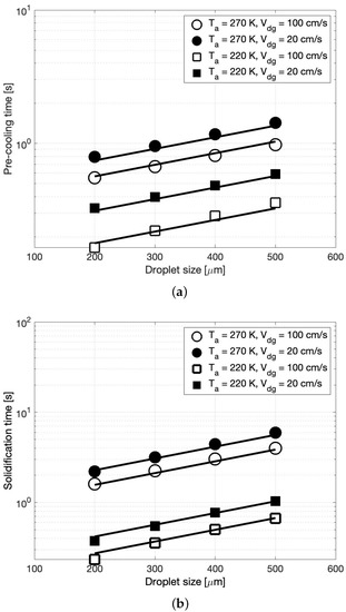 Figure 4a,b summarize the pre-cooling and solidification time, respectively, as a function of the droplet size for all four combinations of ambient temperature and relative drop-gas velocity. In these figures, the circle and square symbols represent the ambient temperatures of 270 K and 220 K, respectively. The open and closed symbols represent a relative drop-gas velocity of 100 cm/s and 20 cm/s, respectively. As seen in Figure 4a, for each drop size, as the ambient temperature decreases, the droplet cools to the solidification temperature of 291 K faster. This behavior is true at both values of . An analogous observation can be made for the solidification time (cf. Figure 4b), i.e., as the ambient temperature increases, the time needed by the droplets to solidify increases. This behavior is explained by the fact that with an increase in the relative temperatures between the droplet and the ambient air, the droplet experiences a rapid decline in its temperature (cf. Equations (8) and (11)). In other words, the droplet will cool faster. Thus, it is desirable to have a low ambient temperature to obtain short crystallization times.
