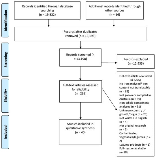 A total of 19,538 articles were identified from literature databases, food composition tables, and grey literature searches (Figure 1). After removal of duplicates, 13,198 articles were screened based on title and abstract, which excluded 12,933 articles. Full text screening of 265 articles excluded a further 225 articles, mostly due to not analysing Australian vegetables or legumes, not reporting iron content with units of measure, or analysing a non-edible component of the vegetable or legume. In this case, 18 studies were excluded because they were unable to be retrieved after contacting library staff, affiliated organisations, and journals. The remaining 40 articles were considered eligible; 34 were primary analyses and 6 were reference food composition databases.