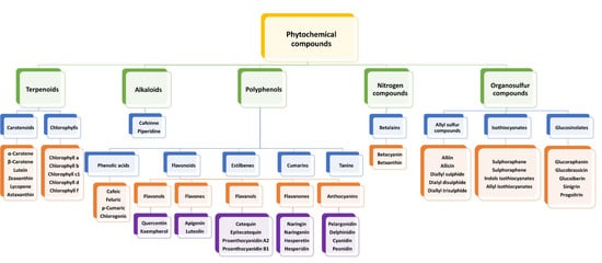 Phytochemicals are defined as compounds obtained from plants, naturally biosynthesized in their secondary metabolism without any essential nutritional values. However, they present lots of health promoting properties according to their biological activity [23]. They are used for several purposes such as drugs, agrochemicals (biopesticides), and food additives (aroma, colorant agents). Phytochemicals were divided into different groups such as terpenoids (carotenoids and chlorophylls), polyphenols, alkaloids, nitrogen compounds, and organosulfur compounds (Figure 1). Three main subsections were made focusing on the greatest relevance groups for this review work: polyphenols (Section 2.1.1), pigments (Section 2.1.2) and organosulfur compounds (Section 2.1.3).