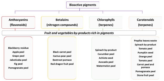 Plant pigments are colored substances produced by plants and are important in controlling photosynthesis, growth, and development [36]. The market for natural colorants is experiencing a boom related to the “clean label” trend. It is worth mentioning that some of the main drivers for the increased demand of natural colorants are the health-promoting benefits of natural food colorants [37]. Researchers and the food industry are exploring stable natural colorants and new natural extracts from F&V by-products [37]. These by-products tissues are rich in betalains, anthocyanins, carotenoids, or/and chlorophylls. Figure 2 shows the classification of bioactive pigments and some examples of commodity by-products rich in these pigments.