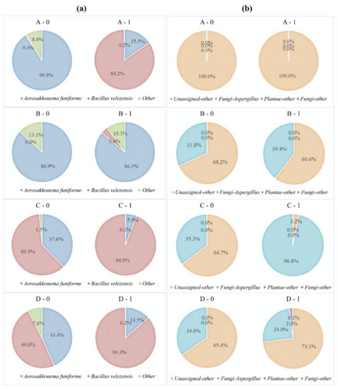 Taxonomic classification at the species level of the (a) bacterial 16S rRNA gene and (b) fungal ITS gene reveals changes in bacterial and fungal communities during one-day fermentation. The experimental groups were inoculated as follows: A, control without starter; B, Aspergillus oryzae single inoculation group; C, Bacillus velezensis and A. oryzae individual inoculation group; and D, B. velezensis and A. oryzae co-inoculation group.