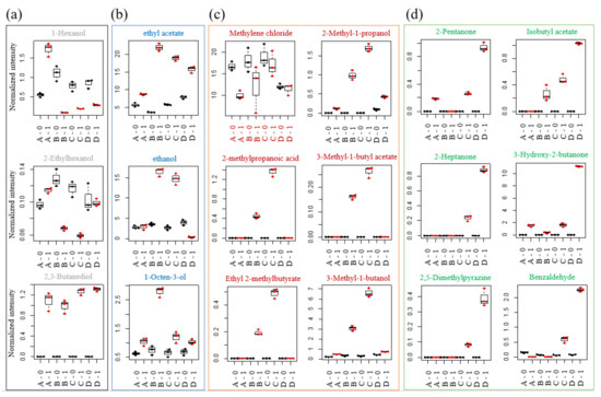 Boxplots derived from GC-MS data from Meju samples reveal metabolic changes during fermentation with different starters. (a) Volatiles increased in Group A as control without starter, (b) volatiles increased in Group B inoculated with A. oryzae KCTC 46471, (c) volatiles increased in Group C inoculated individually with B. velezensis and A. oryzae, and (d) volatiles increased in Group D co-inoculated with B. velezensis and A. oryzae between pre- and post-fermentation for 0–1 d.