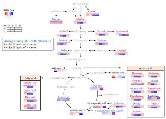 Among the metabolites found by GC-MS, the statistical results of the normalized metabolites showed the metabolites changed significantly during Meju fermentation. Thirty-three Meju metabolites were identified (data not shown). In particular, metabolites, such as organic acids (e.g., lactic acid, malic acid, 4-aminobutyric acid, and ketoglutaric acid), sugars (e.g., sucrose), and amino acids (e.g., alanine, oxoproline, asparagine, and tryptophan), with variable importance in projection values > 1.0 were identified as associated with energy metabolism. A. oryzae contributed more metabolites than B. velezensis.