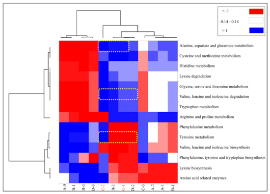 For the initial fermentative samples, red clusters were related to the metabolism of alanine, aspartate, glutamate, cysteine, methionine, histidine, glycine, serine, threonine, and tryptophan and the degradation of lysine, valine, leucine, isoleucine, and tryptophan. Blue clusters were related to the metabolism of phenylalanine and tyrosine and biosynthesis of valine, leucine, isoleucine, phenylalanine, tyrosine, lysine, and amino acid-related enzymes for pre-fermentation. The difference between the clusters indicates there are more degradation function genes grouped in the red cluster and more biosynthesis function genes grouped in the blue cluster. The samples showed changes in their functional profiles at 24–48 h of fermentation compared with those at 0 h. Sample C showed a distinct amino acid profile among the starter-inoculated groups; at 0 h, it was classified into the same cluster as samples B and D at 24 h were, demonstrating that the fermentation rate of sample C was faster than the other samples. After 24 h, sample C showed metabolism of lysine, which is essential for nutrition, which moved it to the blue cluster. These results indicate that the inoculation method for sample C can predict the amino acid pathway from microbial communities. We propose that differences in inoculation determine the quality characteristics of Meju.