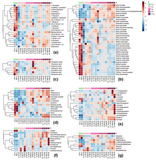 Clustered heatmaps of volatile compounds in wine made of clone 169 and 191 aged in two types of oak barrel during the aging process. T-0, T-3, T-6, T-9, and T-12 represent before aging, 3-month aging, 6-month aging, 9-month aging, and 12-month aging, respectively. Y191 and Y169 represent wine made of clone 191 and 169 before aging, respectively. W191 and W169 represent wine made of clone 191 and 169 aged in Wolin oak barrel for 12 months, respectively. B191 and B169 represent wine made of clone 191 and 169 aged in Bordeaux oak barrel for 12 months, respectively. (a) C6 alcohols and higher alcohols, (b) esters, (c) fatty acids, (d) terpenes and norisoprenoids, (e) volatile phenols, and (f) furanic compounds, phenolic aldehydes and oak lactones, (g) other compounds.